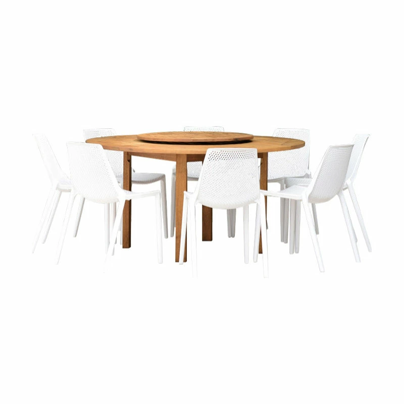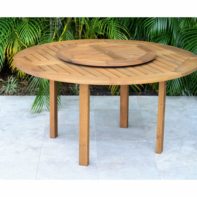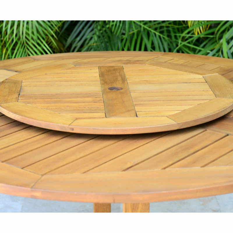 Outdoor Dining Set: This set includes 1 high quality 100% FSC certified eucalyptus dining table with Teak Finish and an additional rotating (lazy Susan) table. Resin Chairs are ideal for both indoors and outdoors.