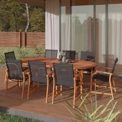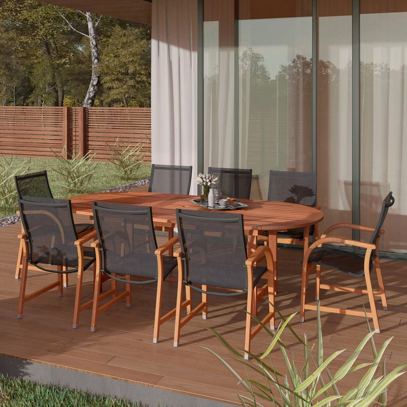 【9-Piece Set】This set includes 8 high quality 100% FSC certified eucalyptus dining chairs and 1 extendable oval table. This set is ideal for both indoors and patio and will make your outdoors an elegant space to enjoy with family and friends.