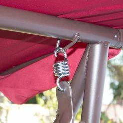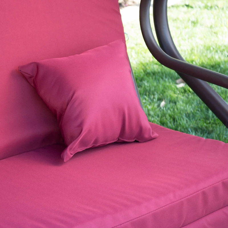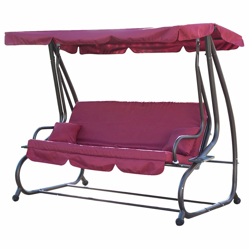 Patio Swing can fit with any home or backyard. With its durable frame and comfortable cushioned seating, this seat will provide any family with a great place to relax during the summer nights. The cover provides protection from the sun and with a cup holder on each side you can enjoy your favorite drink as you swing. The stylishly curved steel frame reinforces the swinging seat so that you can forget your worries as the wind pushes the swing. The seat itself is adjustable so that it can be set in an upright seated position or it can lock in to the support bar and become a lay down bed. This makes it so you can relax comfortably while it will also lock in place to allow a safe place to lie down. Assembly is required, however the pre-drilled holes and easy to fit in pieces makes it able to be set up in minutes