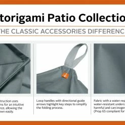 Classic Accessories Storigami Easy Fold General Purpose Patio Furniture Cover, Monument Grey, LargeThe Storigami Collection, by Classic Accessories: a new standard in the art of cover folding. Neat, structured, and convenient, these covers use purposeful seams to allow the cover to collapse along mountain and valley lines, creating an intuitive cover handling system, allowing you to fold your cover down to a manageable size every time. Storigami covers are for anyone who appreciates storage efficiency and maintaining a tidy home. Let Storigami streamline your process, so you can Uncover More Time Outdoors.