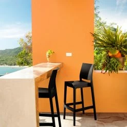 Maya resin barstool is made of durable weather resistant resin reinforced with glass fiber. No metal parts to rust, no moving parts to break. Made for commercial durability. Barstools are stackable. Perfect for heavy uses areas such as hotels and restaurants. UV Treated. Hose down for easy cleaning. Withstands outdoor temperatures in summer and winter.