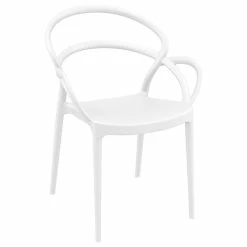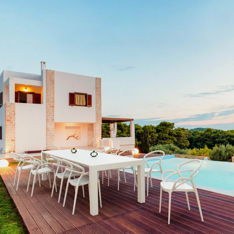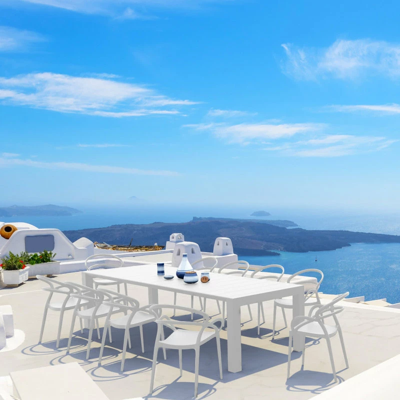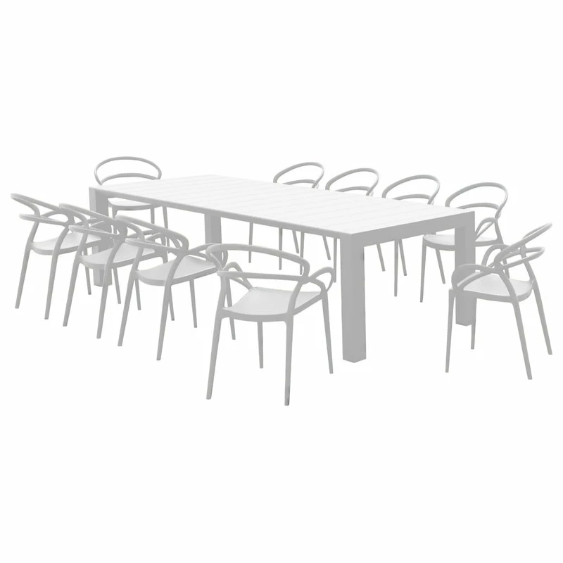 Mila dining set with 10 armchairs and an extendable dining table. Indoor outdoor dining armchairs are commercially graded. Easy cleaning. Perfect for heavy use. Table extends from 102 inches to 118 inches. Resin top with the latest generation of thermoplastic legs.
