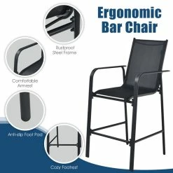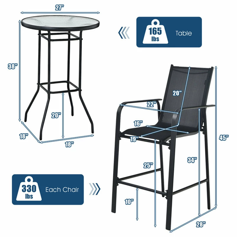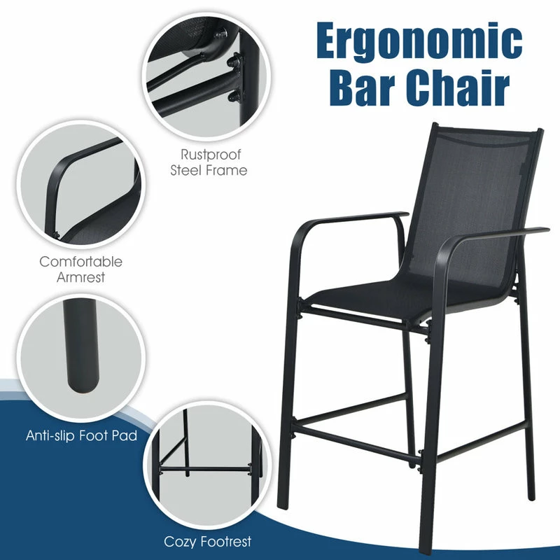 With anti-rust steel frame and fast-drying fabric, this bar height furniture can be enjoyed outdoors for many years. Additionally, the breathable fabric, comfortable armrests and considerate footrests bring comfortable sitting experience. And the heavy duty steel frame with anti-slip foot pads provides strong loading capacity. Moreover, maintenance is quite easy. The smooth tempered glass tabletop is convenient to clean.
