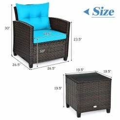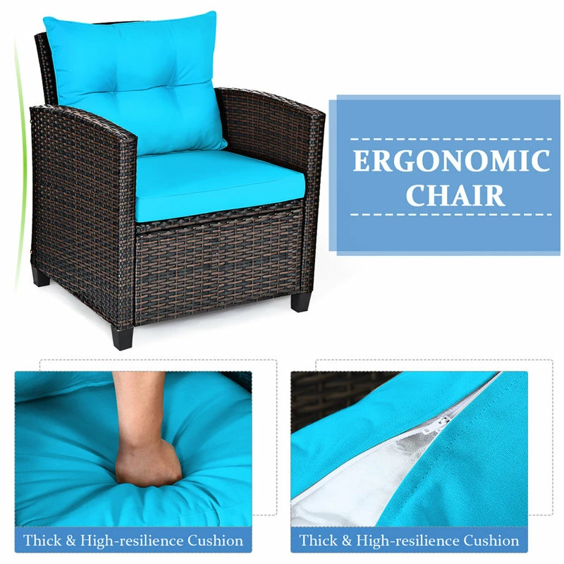 Do you want to drink coffee or have a break with your friend in your outdoor space? Our 3-piece outdoor rattan furniture set is great for you. It can be used as a cozy corner in garden, backyard, porch, pool and cafe shop both for indoor or outdoor space. Made of sturdy steel and high quality rattan, the sofa set is sturdy and durable which can be used for long time. Comes with a tempered glass top table, not only can you place some drinks or snacks on hard tabletop to take conveniently but also some decors like vase can be put on the tabletop. The sofas are equipped with back and seat cushion which will give you excellent comfort. And the cover of seat cushion has zipper for removing and rinsing easily. It’s perfect to relax and enjoy time with your friends and family.