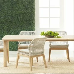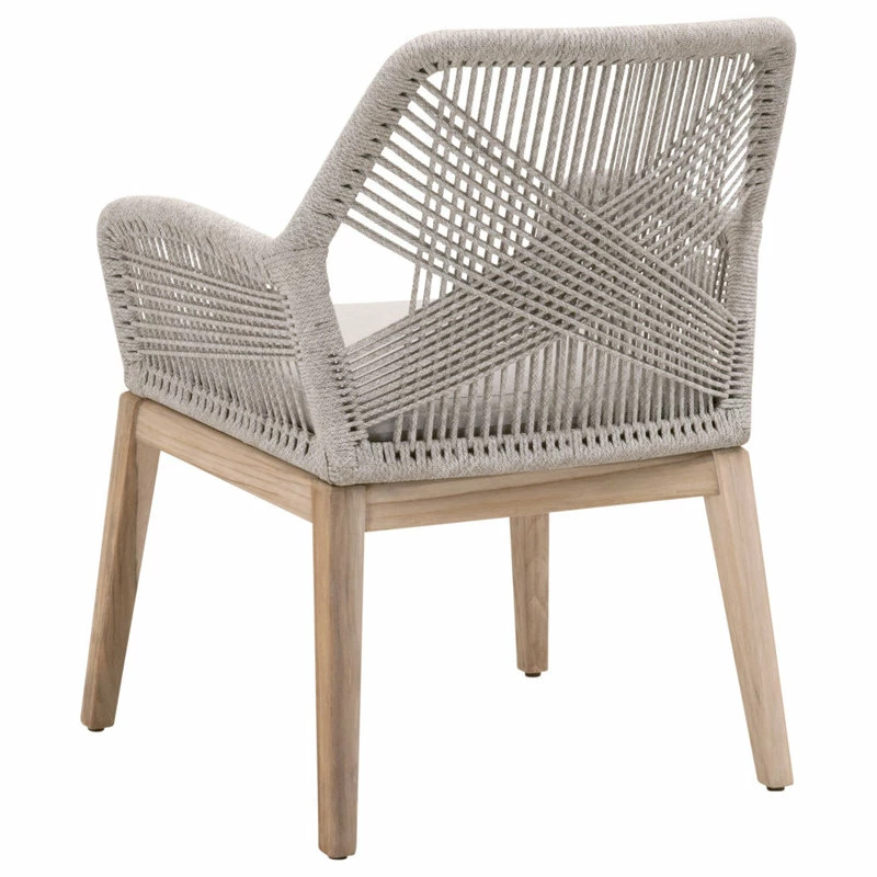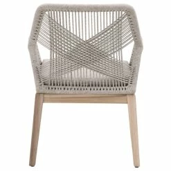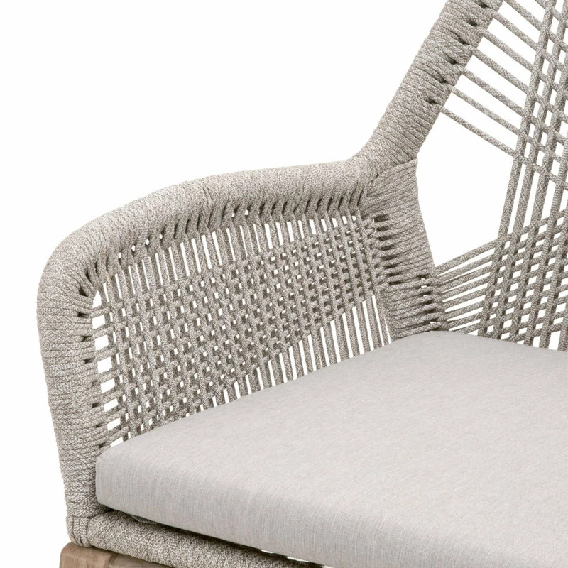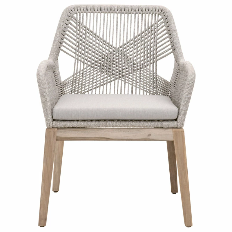These woven arm chairs will add a touch of coastal style to your kitchen or dining space. Constructed with an aluminum frame and solid mahogany legs, these chairs are not only sturdy, but durable. A rich platinum colored rope is tightly woven to create a unique loom design, while the wood legs have a beautiful distressed Natural Gray finish. Paired with a removable Pumice seat cushion, the chairs provide comfort with style and will be the perfect addition to any transitional or traditional dining room.