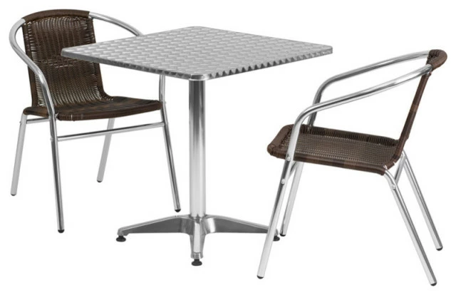 Create an enjoyable dining experience with this table set that will enhance your bistro, cafe, restaurant, hotel or home patio space. The designer style stainless steel table top features a smooth surface for keeping items level. The column and base are constructed of lightweight aluminum material. The chair is lightweight and easy to move and store. For easy storing and cleaning purposes these chairs stack up to 20 chairs high. This set was designed for all-weather use making it a great option for indoor and outdoor settings. For longevity, care should be taken to protect from long periods of wet weather.