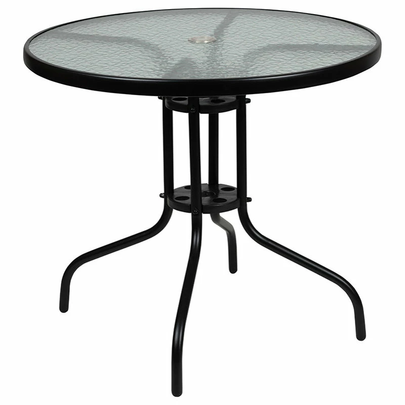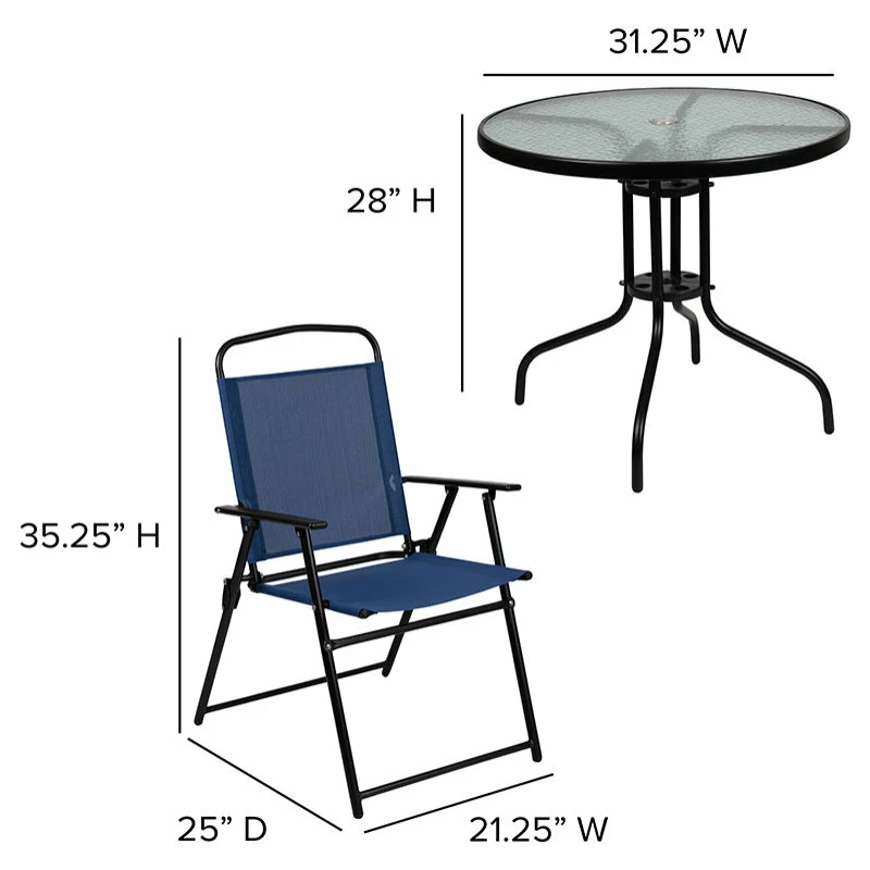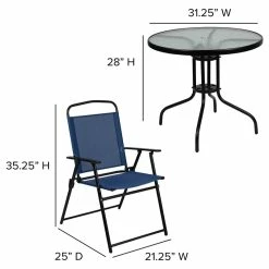 - Glass Patio Table: 31.25″W x 31.25″D x 28″H; Base Size: 17.75″W x 19″L