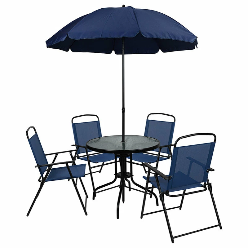Take advantage of the nice weather and eat your meals on the patio on this stylish 6 piece patio garden table set with umbrella. If you want to relocate your seating to another location on the deck, sit poolside or take it with you while camping or to an outdoor sporting event, the lightweight and compact design offer an easy to transport option. You can enjoy this set quickly, assembly of the table goes up in minutes and the chairs come fully assembled. The folding chairs are upholstered in a durable, breathable textilene material, designed for all-weather use. The attractive rippled tempered glass sits atop a 4-legged metal framed base. The included umbrella will shade you on those sunny days and has a tilt function that is activated by pushing the plastic ring on the pole. For longevity, care should be taken to protect from long periods of wet weather. Clean with a water based cleaning solution to keep in pristine condition. Take the stresses of the day away with this all-in-one patio table set for dining, entertaining, and relaxing. [GM-202012-NV-GG]