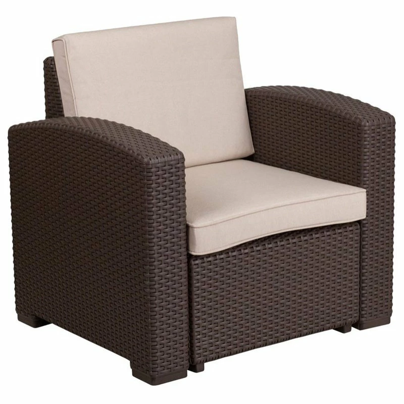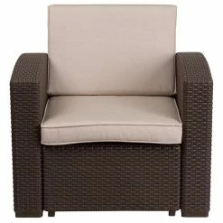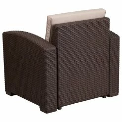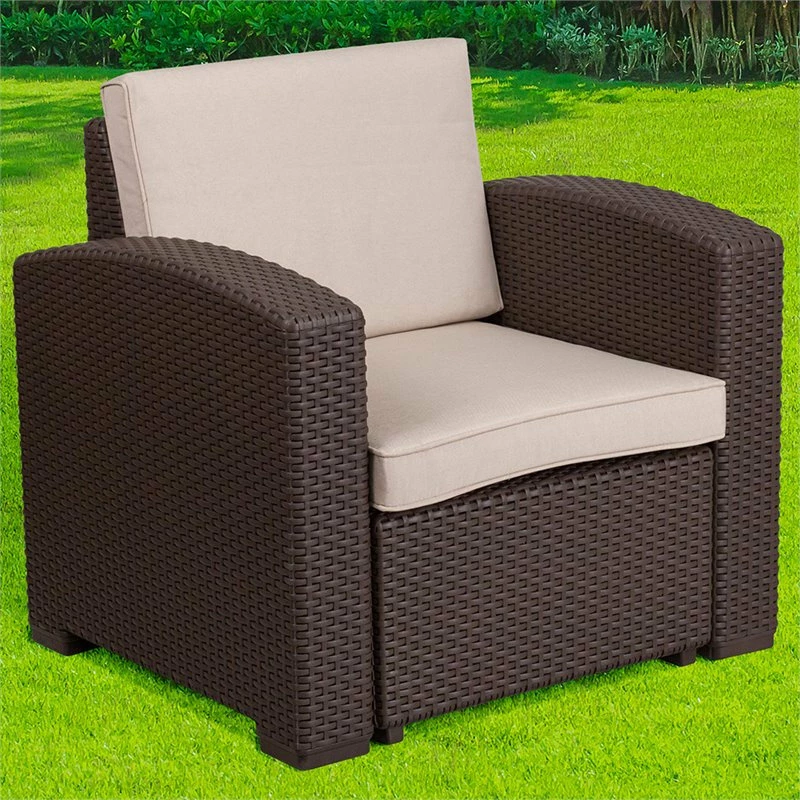 Create an amazing outdoor space with this comfortable and stylish chocolate brown patio chair. The durable resin frame offers a stylish appearance which replicates rattan. Deep seating enhances the comfort level. Beige all-weather cushions will hold up all season long. Clean up spills with a water-based cleaner or the cushions are zipper removable for washing purposes when spot cleaning just isn’t enough. Curl up with your latest read, or just relax and enjoy the outdoors with family and friends and create lasting memories!
