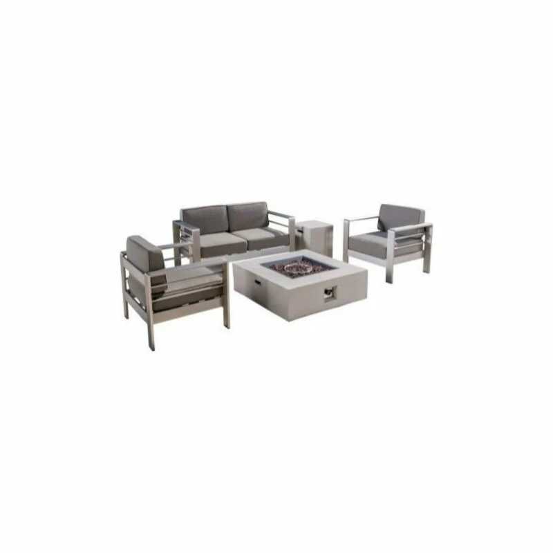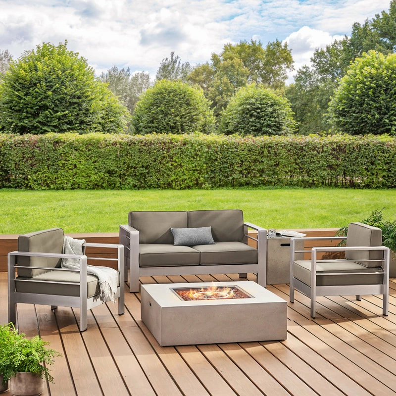 This chat set features two club chairs, a love seat, and a wonderfully warm fire table for you to enjoy all year long. Made with top quality aluminum, each of the chairs and loveseat feature both comfort and quality craftsmanship. The fire table is made with magnesium oxide to provide superior quality and performance. This set will have you spending your days and nights outside enjoying the freedom of your backyard.