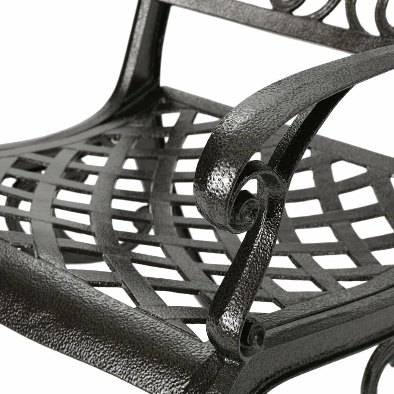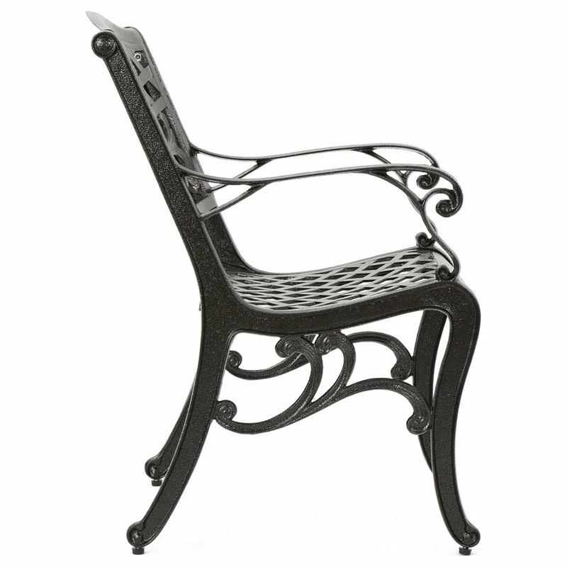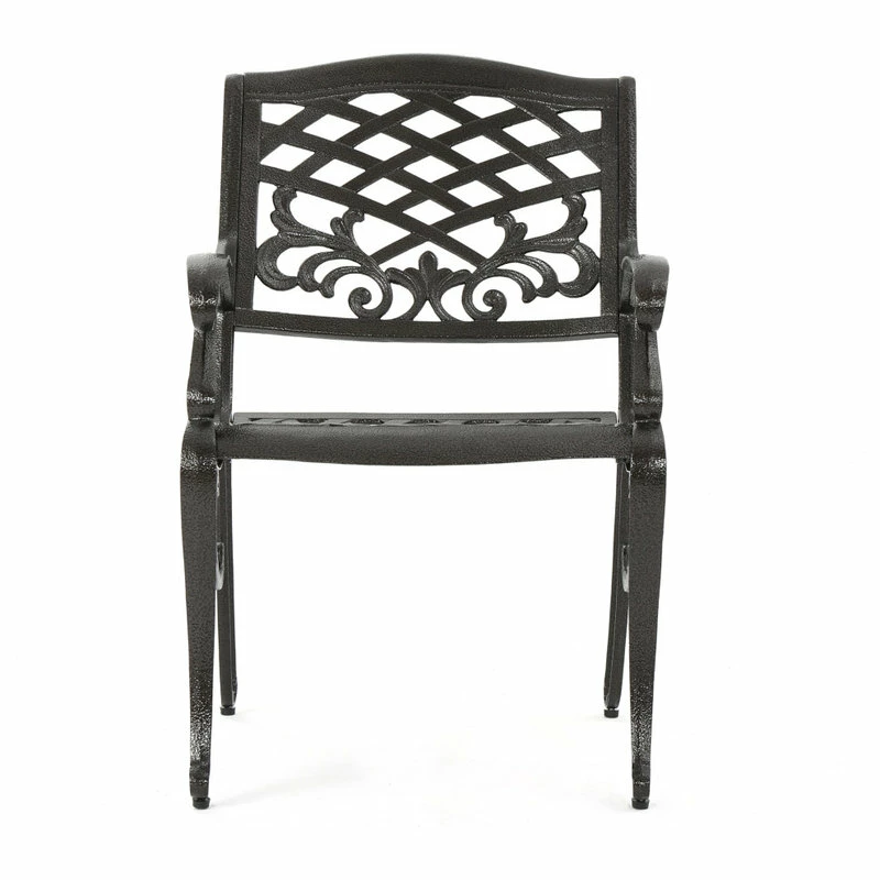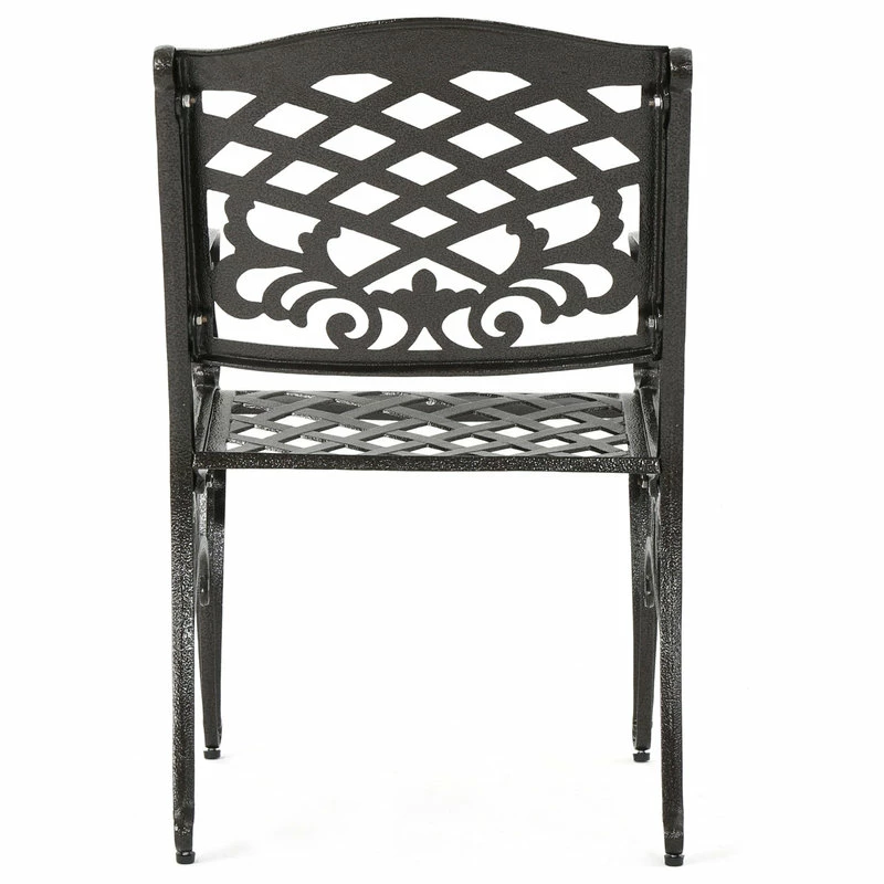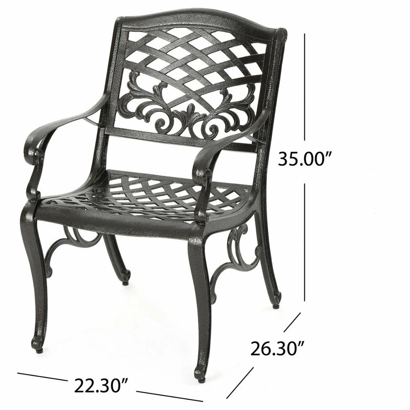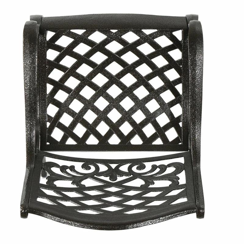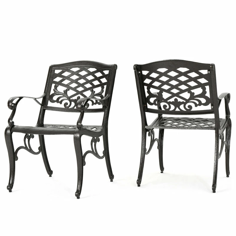 Make a sophisticated, timeless, and brilliant choice for your outdoor dining space with this lovely pair of dining chairs. These stunning dining chairs feature floral-accented lattice patterns for a timeless, nature-inspired touch. Cast aluminum construction means they’re incredibly sturdy and well-made. Whether you’re pairing them with a small table to create an intimate locale for your morning cup of coffee, or you’re adding more seating around your large outdoor table, these chairs are sure to complement your impeccable design aesthetic.
