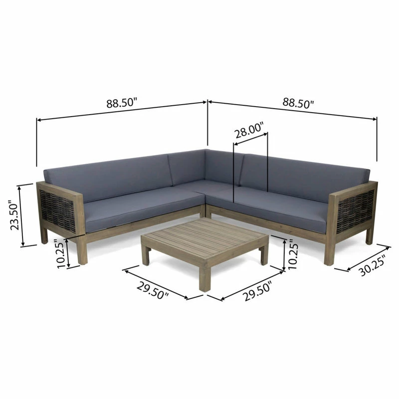 - Includes: One (1) Left Arm Sofa, One (1) Right Arm Sofa, One (1) Corner Seat, and One (1) Coffee Table
