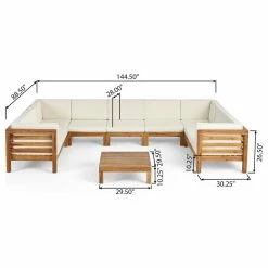 Hosting any summer backyard get-together will be a breeze with our charming sectional sofa set. This conversation set offers a modular design that makes this the ideal centerpiece for any outdoor event. With solid acacia wood frames, plush outdoor cushions, and a slatted coffee table, this sectional can easily seat nine in both comfort and style. This configurable design allows a personalized touch to your lounge space, offering hours of fantastic conversation for you and your guests for years to come.