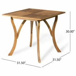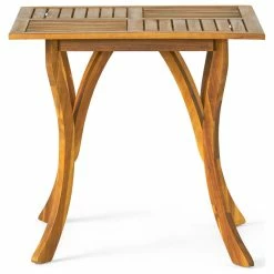 Enjoy this outdoor acacia wood table, prefect for any patio set up. Featuring a beautiful teak finish, smooth lined legs, and a wooden slated tabletop, this table will compliment any patio style. This table is a must have.