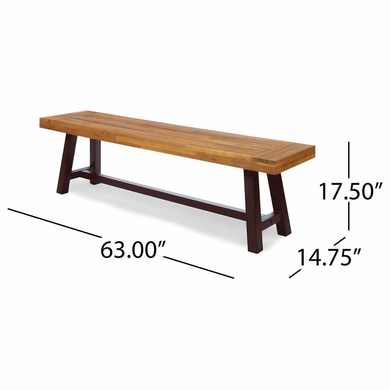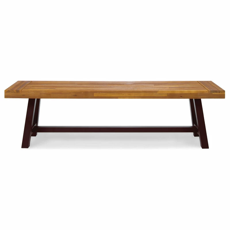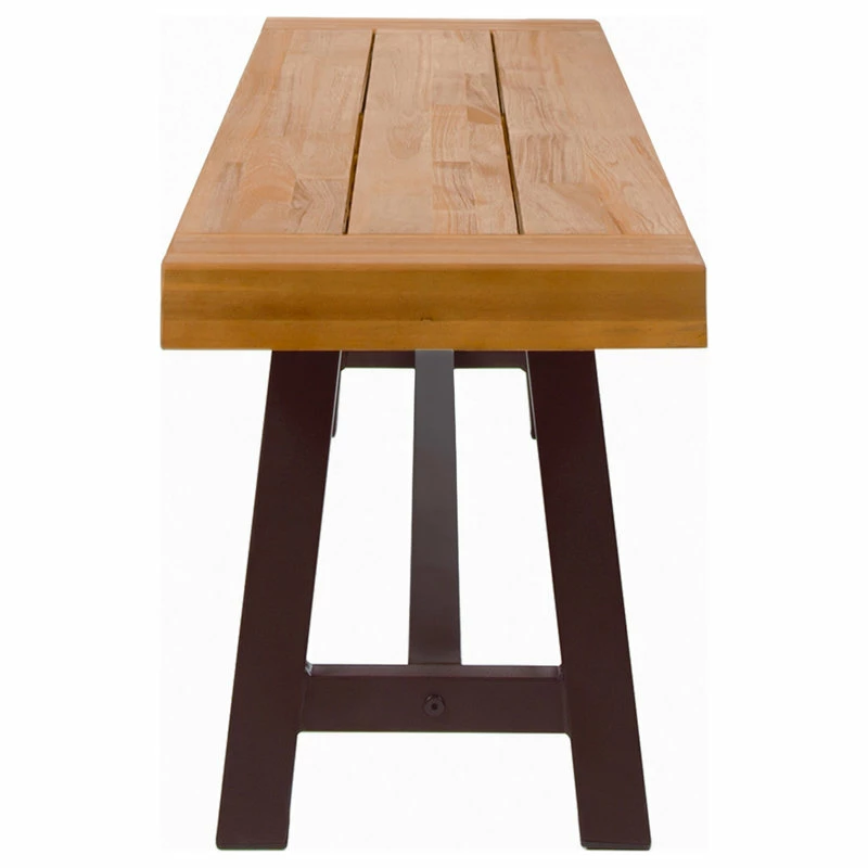 Add seating to your backyard or around your patio table with our functional and stylish outdoor bench. Contemporary, yet completely approachable and casual, this bench pairs beautifully with any of our incredible outdoor dining tables for a one-of-a-kind outdoor entertaining space. The acacia wood top brings warmth and natural beauty to the multi-use seating option. This breathtaking bench boasts a slat panel top that contributes to the detailed, textured, industrial modern aesthetic. Turn to our gorgeous outdoor bench for adaptable style, comfort, and practicality.