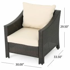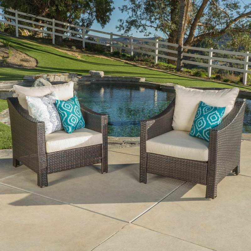 These wicker club chairs are a great addition to any patio. The water resistant cushions make both the chair and the cushions ideal for an outdoor setting (good to stay out all summer long.) The slight curve of the arms adds the perfect amount of flair, giving you a stylish and comfortable set of club chairs for your patio.
