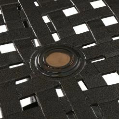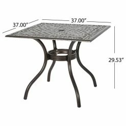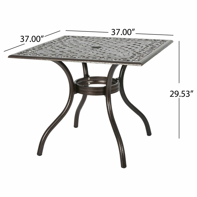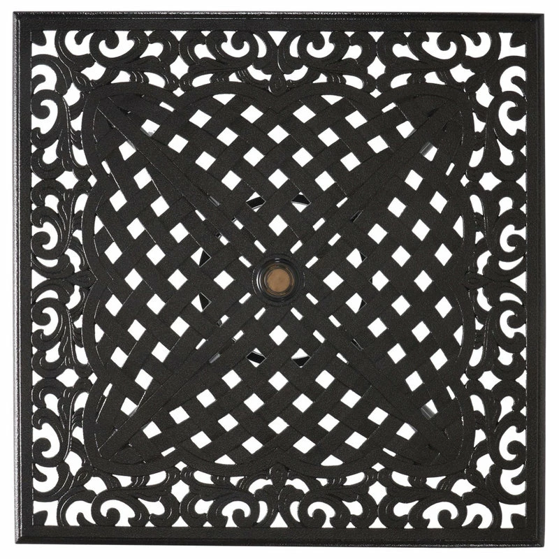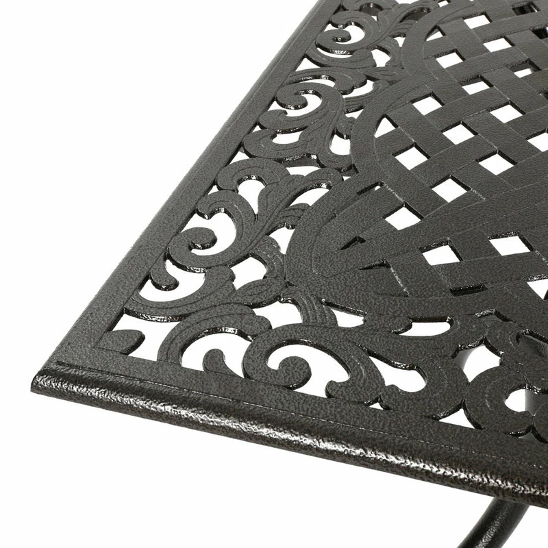 Enjoy this cast aluminum table for years to come. Featuring a gorgeous, intricate, lattes table top, with a hammered bronze finish, this table is sure to not only complement and enhance your patio, but also give you that perfect amount of extra table space you need.