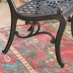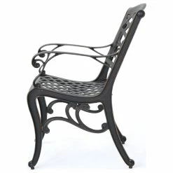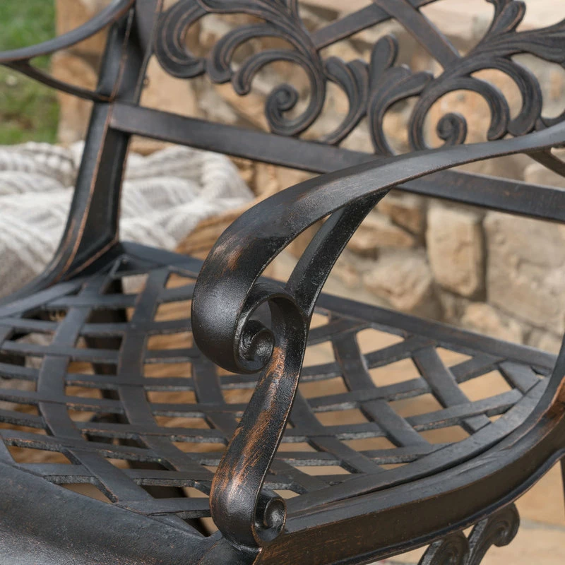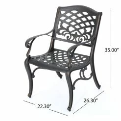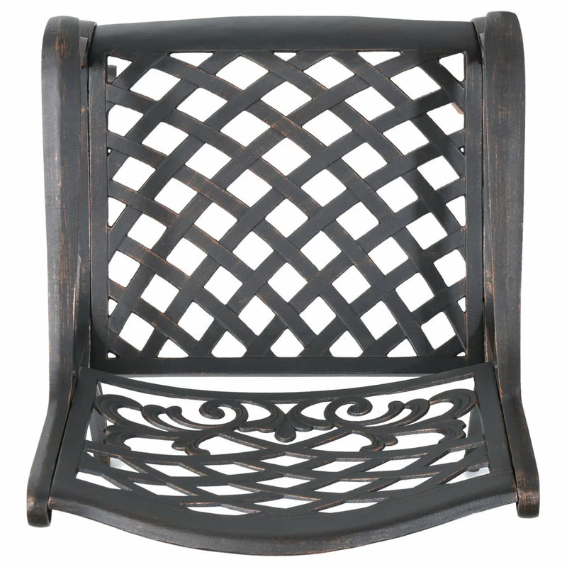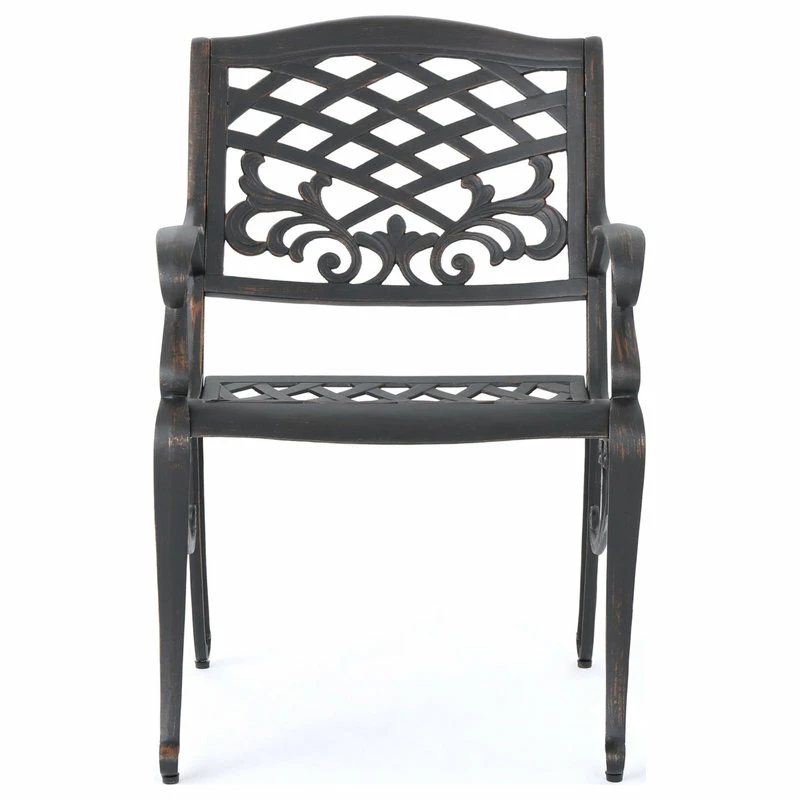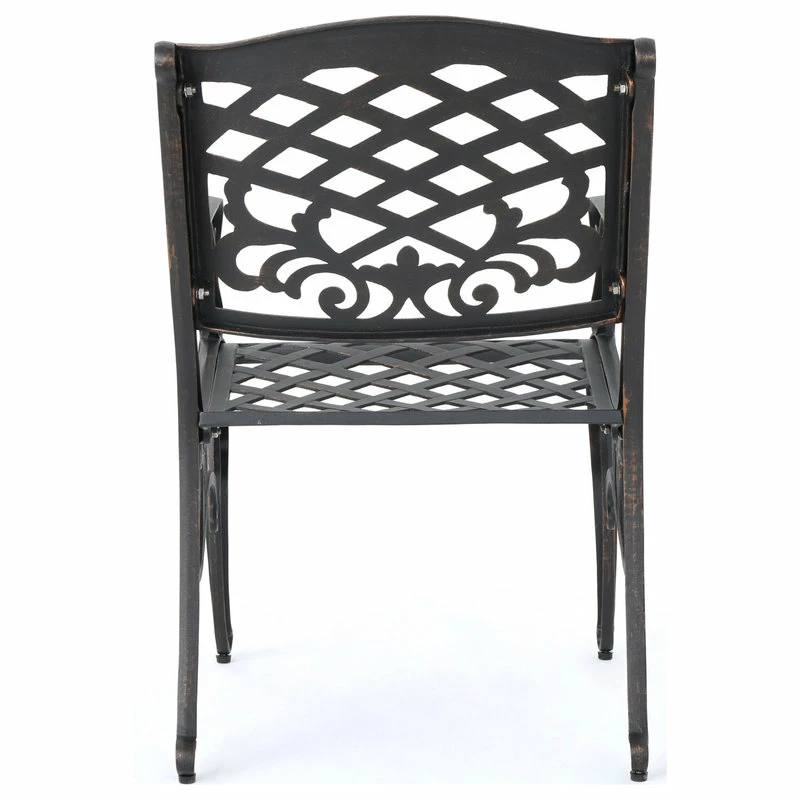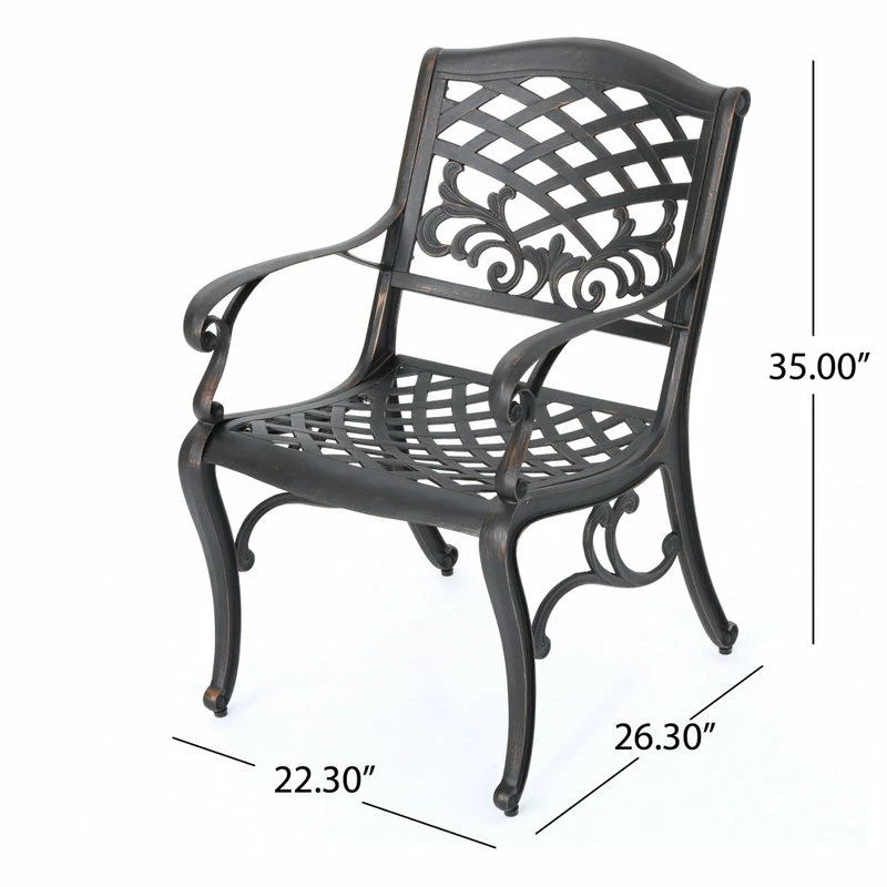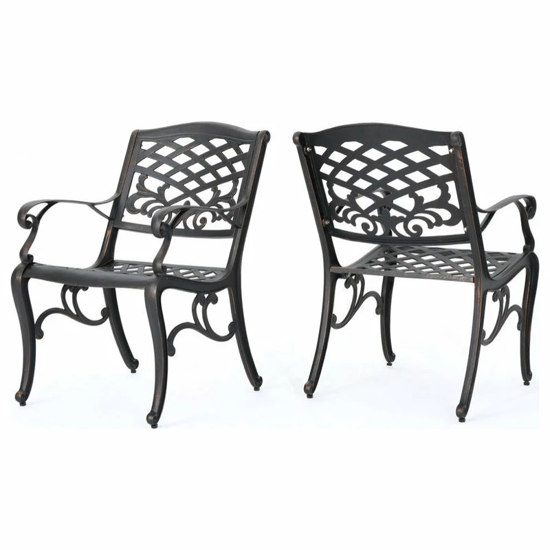Make a sophisticated, timeless, and brilliant choice for your outdoor dining space with this lovely pair of dining chairs. These stunning dining chairs feature floral-accented lattice patterns for a timeless, nature-inspired touch. Cast aluminum construction means they’re incredibly sturdy and well-made. Whether you’re pairing them with a small table to create an intimate locale for your morning cup of coffee, or you’re adding more seating around your large outdoor table, these chairs are sure to complement your impeccable design aesthetic.