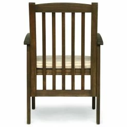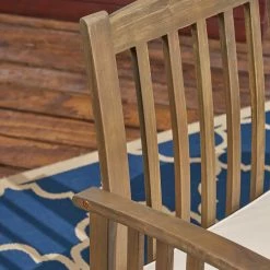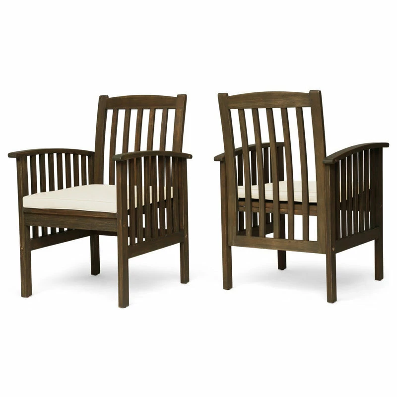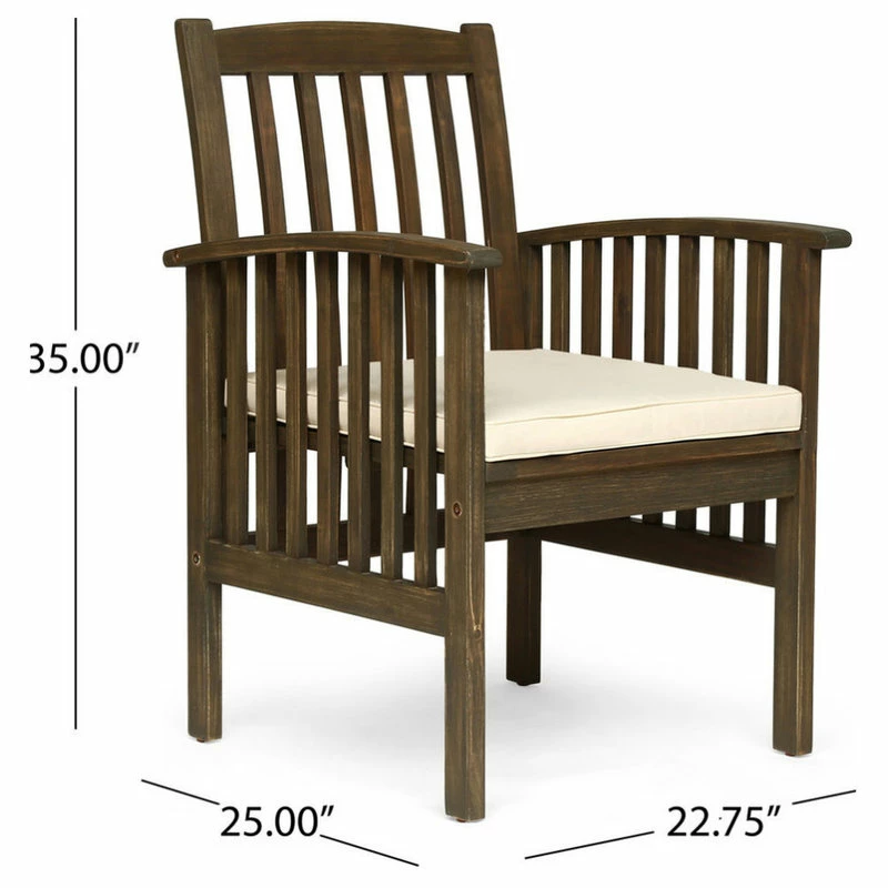 UPSCALE AND CLASSIC DESIGN – slatted back. Lightweight. Gray finish with cream cushions. 25.00″ x 22.75″ x 35.00″. Arm Height: 25.50″ high. Includes two (2) dining chairs.