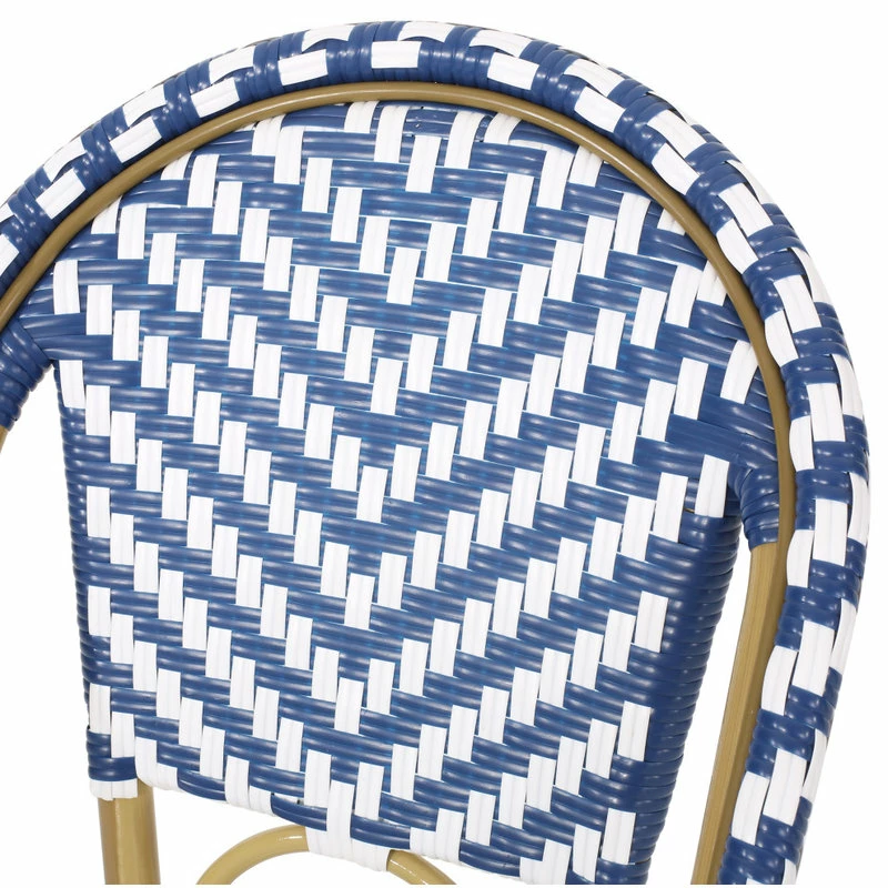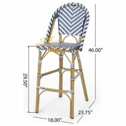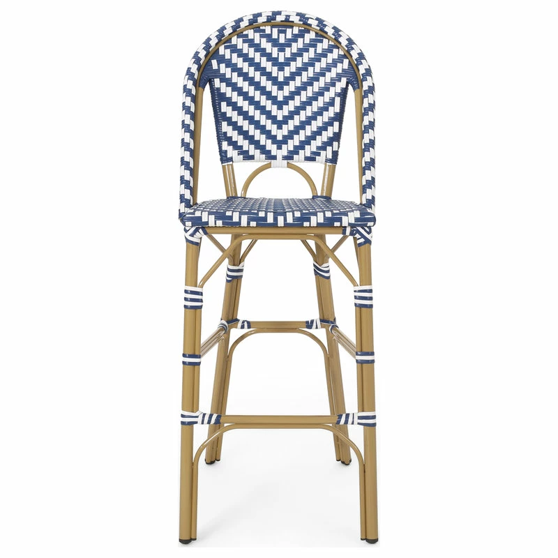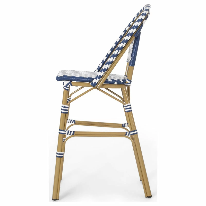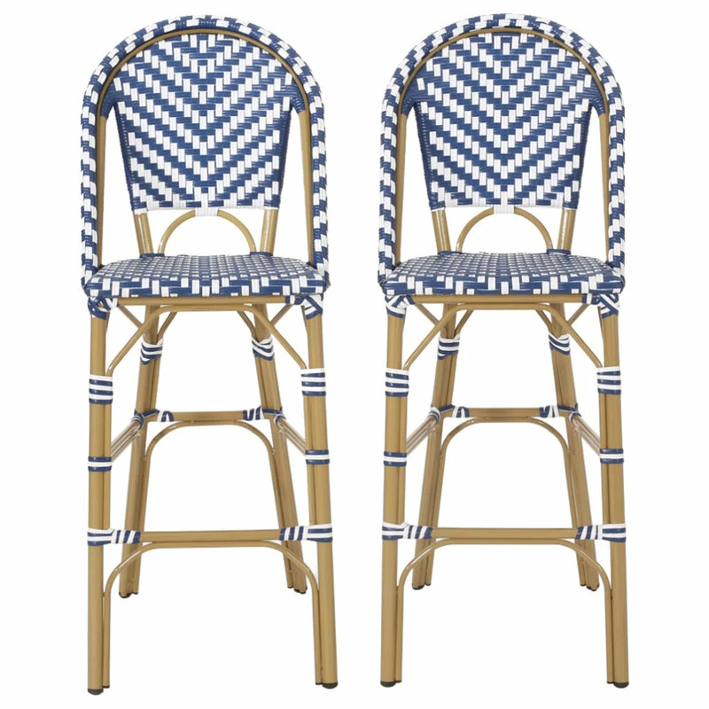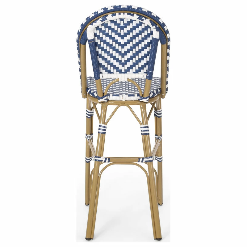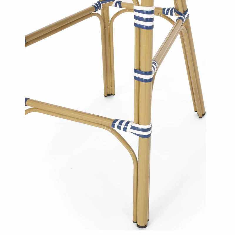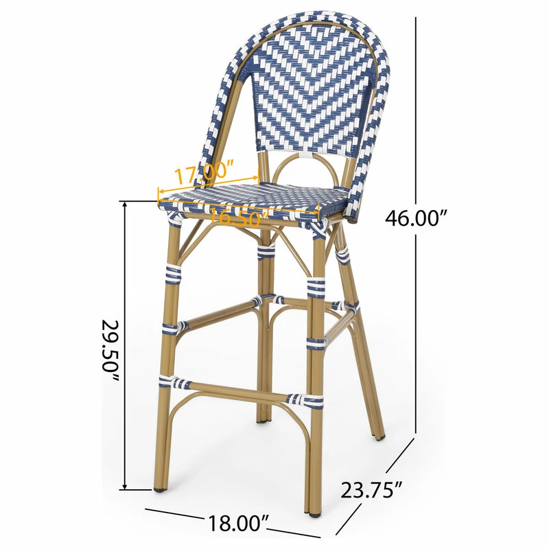 Take a seat in streamlined style that will have you feeling like you are enjoying a fresh cup of coffee or chilled drink at your favorite cafe. Composed of smooth bamboo finished aluminum frames and stunning wicker weave seating, these eye-catching French-inspired barstools will complement any outdoor bar or dining set up, bringing a subtly upscale flair to even the most unassuming home. Each stool is crafted with precise durability that strikes a perfect balance of classic charm and modern sophistication for all to admire.