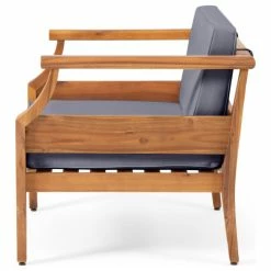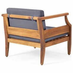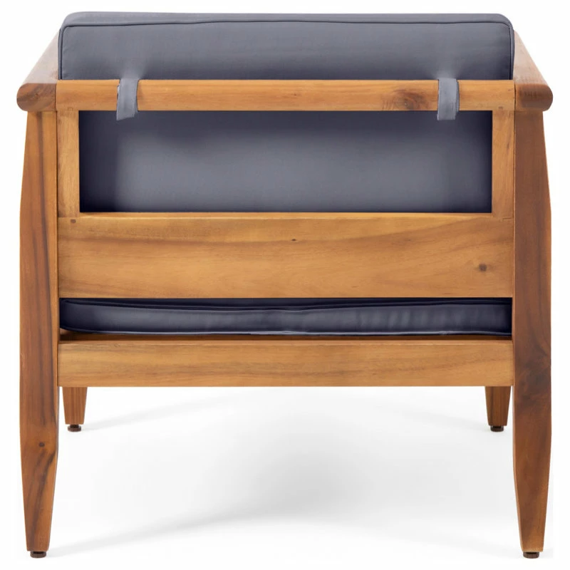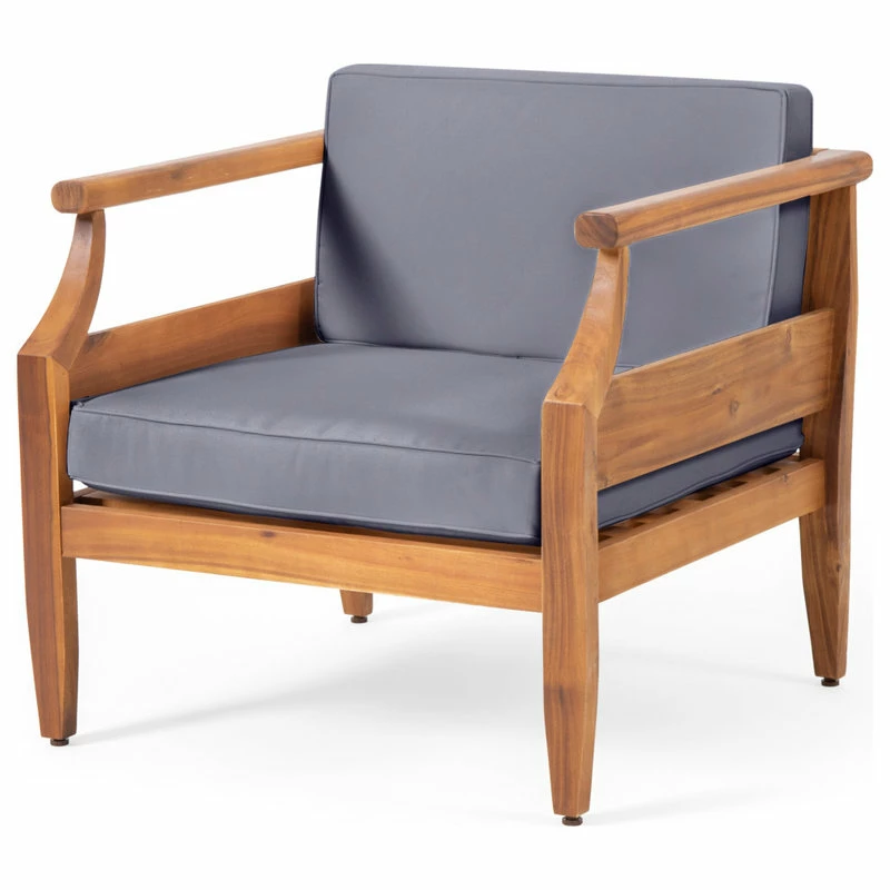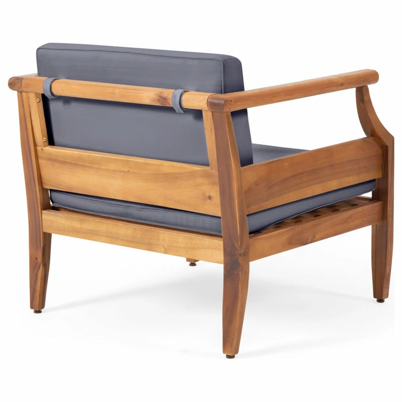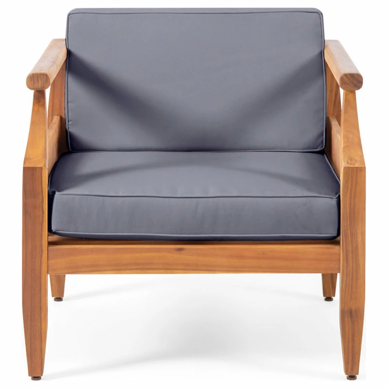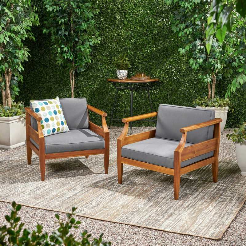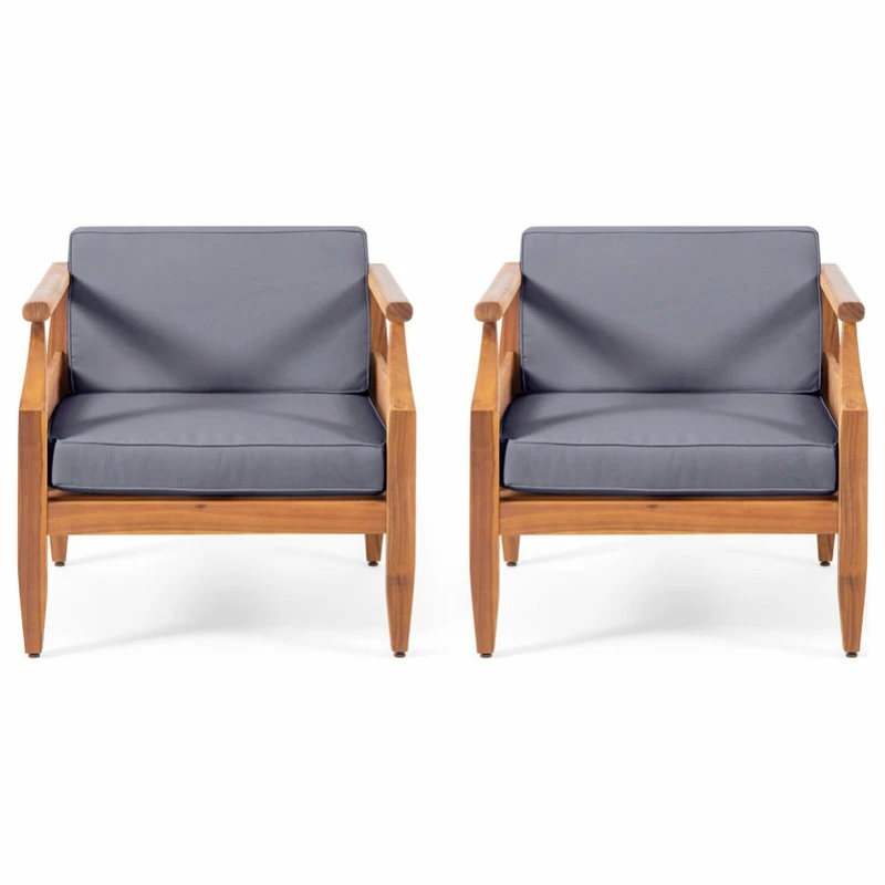 Enjoy the outdoor breeze and warm sunshine in a set of club chairs that offers your backyard or patio sophisticated style. Our club chair set features a sleek design, including lovely recessed arms and open slat seating for a breezy look. Finished with a rich acacia wood frame and water-resistant cushions, these chairs offer a sturdy place for you and your guests to rest comfortably. Your outdoor space will thank you for making the most of your ensemble with this perfect set of chairs.