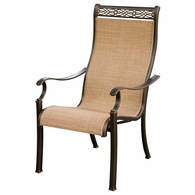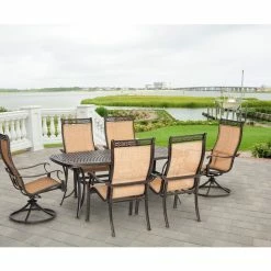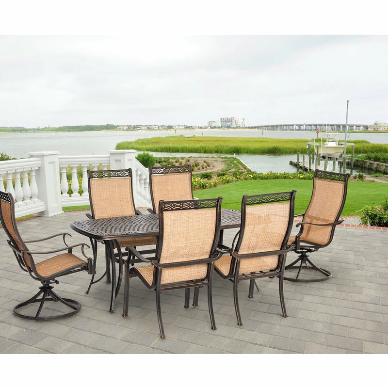Treat your family to a new dining experience With the Manor 7-Piece Dining Set by Hanover Outdoor. This set includes one large dining table, four stationary dining chairs and two swivel rockers. Both sophisticated and refined, this set offers the perfect accommodation while Your entertaining your guests outdoors. The chairs feature tall, sling-back seats that provide upper and lower back support as you dine in comfort and style. The aluminum frames are polished With a protective bronze coating that highlights the cast-accents that scroll across the top of the table and chairs. The two swivel chairs perform a smooth, 360-degree spin and rocking motion. Designed for many years of enjoyment, this outdoor set will provide a natural alternative to dining indoors and will provide your guests With the best accommodations under the sun.