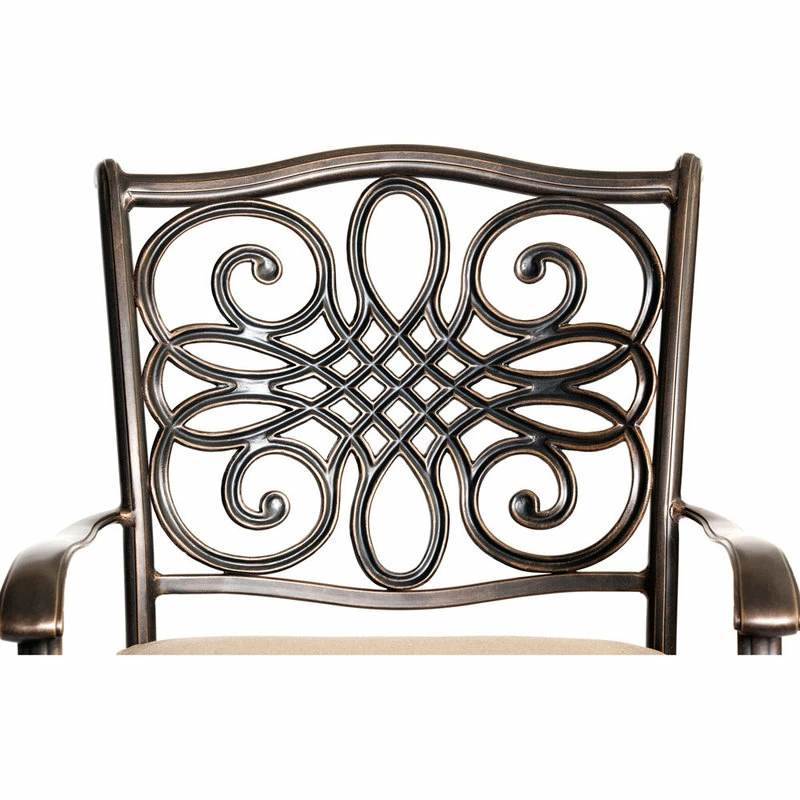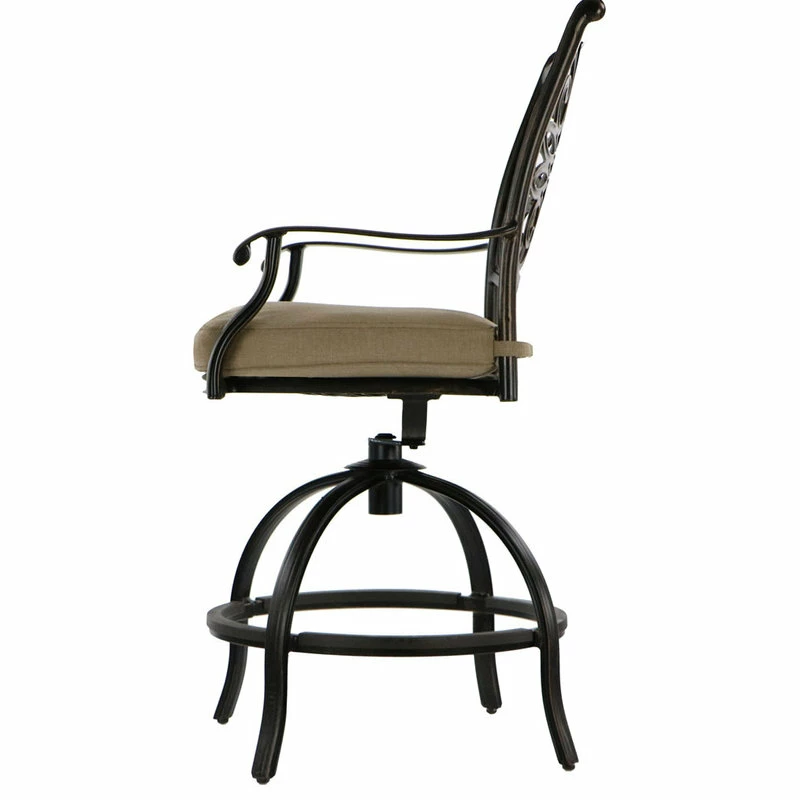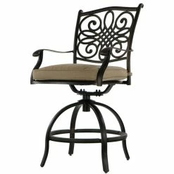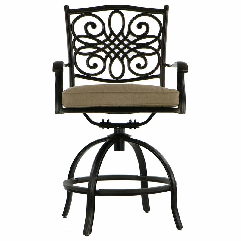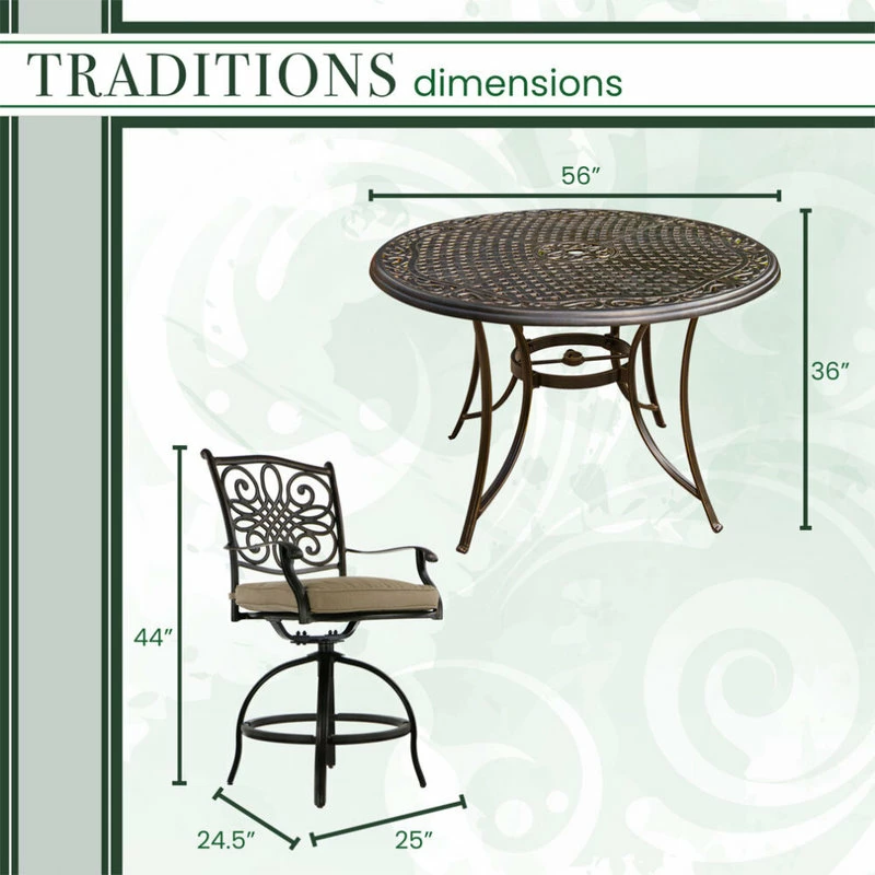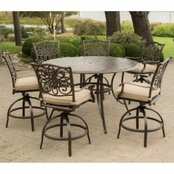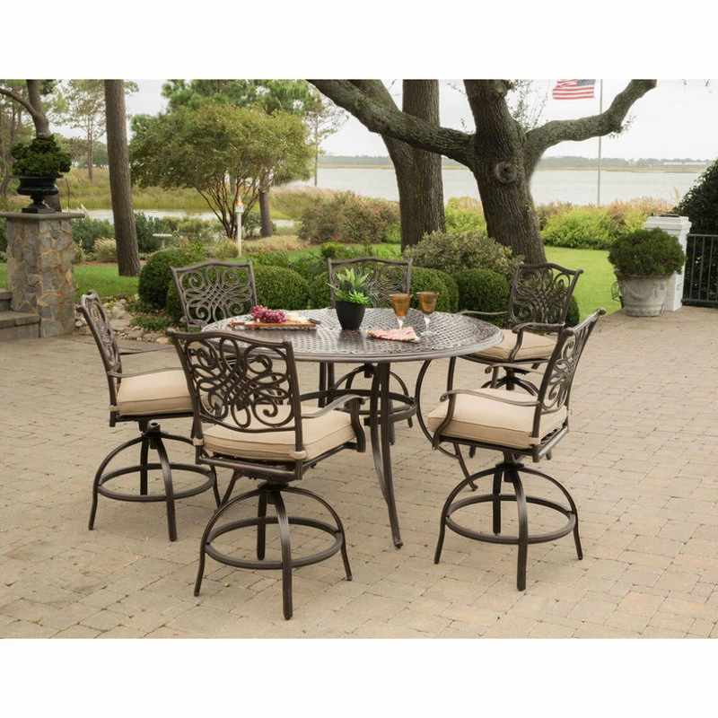Take comfortable dining to the next level with the Traditions 7-piece high-dining set from Hanover. This set includes six swivel chairs and a 56 in. cast-top table� each standing at a trendy counter-height. The chairs and table are constructed with heavy-duty aluminum frames and dressed with elegant cast details. Plush seat cushions are included for each chair providing maximum comfort throughout the meal. These cushions are made up of thick layers of foam and wrapped in premium outdoor fabric that resists moisture, stains, and UV harm. The round dining table offers ample room for food and beverages as well as a generous amount space for entertaining guests. Built to last, this high-dining set will bring each meal to new heights and greet your guests with the ultimate comfort.