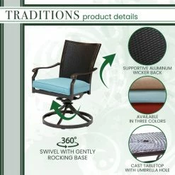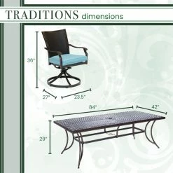 Take your meal outdoors with the Traditions 9-piece dining set. This set includes eight wicker back swivel rockers and an extra large 42 x 84 in. cast-top dining table. The spacious dining table features an intricately patterned cast top and offers a generous amount of room for food and beverages. With its decorative and supportive aluminum wicker-textured back, the swivel rocker performs a smooth, 360-degree spin and gentle rocking motion for guests to enjoy. Thick foam seat cushions are provided for each chair ensuring maximum comfort and relaxation. Sealed in premium outdoor fabric, these cushions are treated to resist water, stains, and UV fading while also maintaining their original shape. Designed for hosts who enjoy entertaining outdoors, let the Traditions dining collection provide the perfect setting for your next outdoor event.