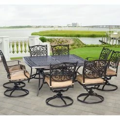 Turn to the Traditions 9-Piece Dining Set for the best in outdoor dining by Hanover Outdoor. Eight swivel dining chairs offer a 360-degree spin and rocking performance while you entertain your guests around the gorgeous 60 in square table. The elegant cast accents of the Traditions Collection add a level of sophistication and craftsmanship found in the lattice-cut tabletop and intricate scrollwork across the back of each chair. Eight foam seat cushions are included for each chair, offering additional comfort to your family and guests. Enjoy the peace-of-mind knowing the materials are treated to resist weather, rust and UV fading throughout the years, making this a quality dining set to have as the centerpiece of your backyard or patio.