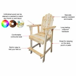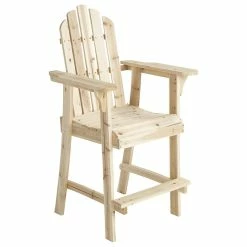 Featuring a tall design with high back, wide seat, arm and foot rests that is ideal for balconies or other outdoor spaces that have tall railings, this well crafted, solid natural wood Adirondack chair is built from long-lasting, low maintenance wood that has been treated to be resistant to the weather. Moreover, the attractive grain and knotty grade of the wood adds to the chair’s appeal.