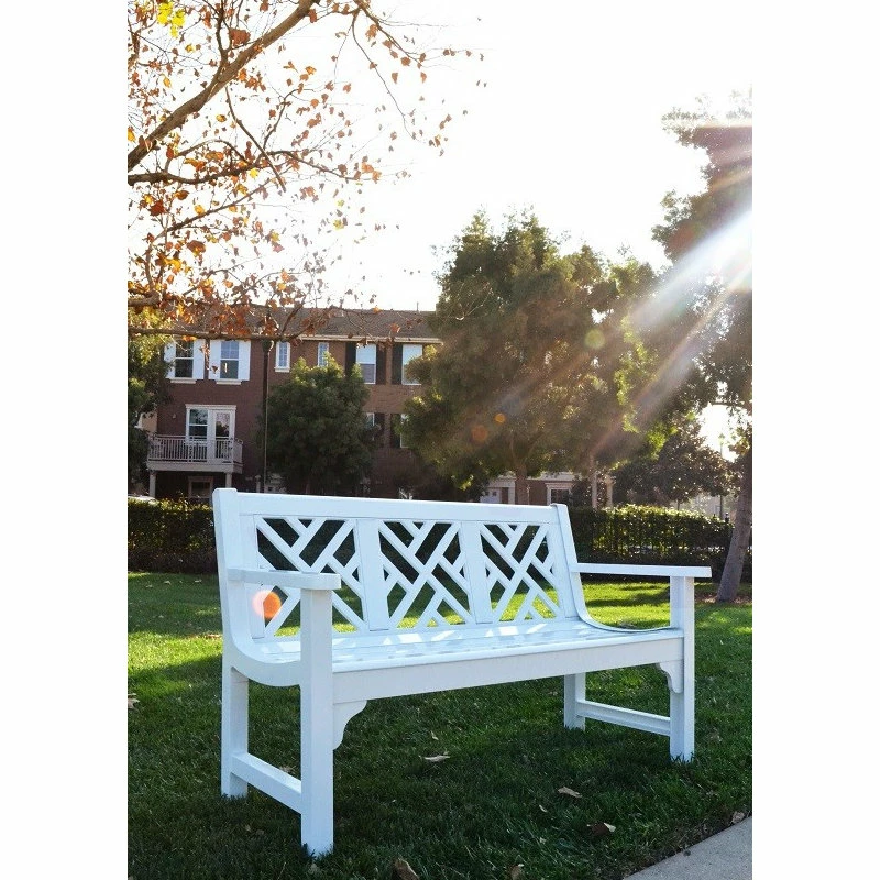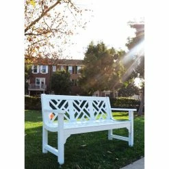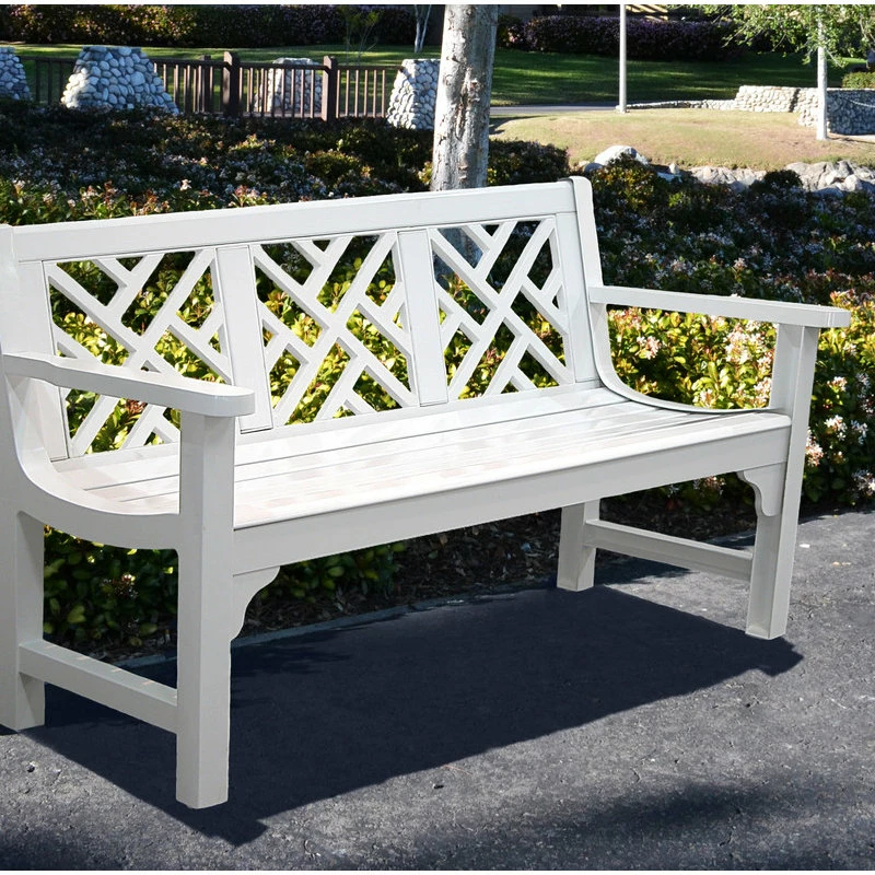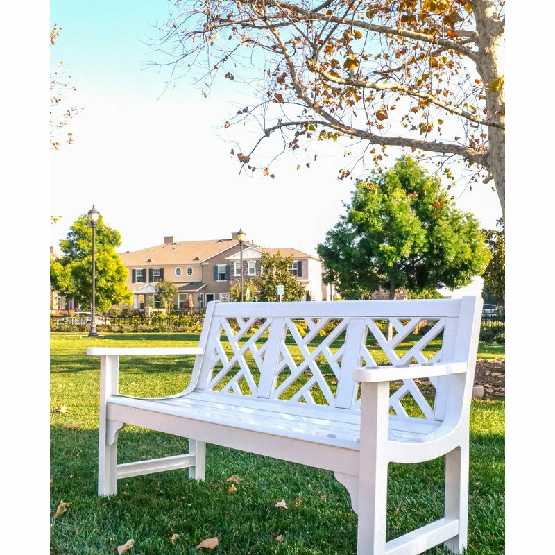 The sophisticated Chippendale Bench in Glossy White makes for charming outdoor decoration and luxurious seating for two. This stylish bench features a uniquely modern back rest with geometric cutouts that are sure to attract attention. The heavy-duty cast-aluminum bench has all the sturdiness of real wood without all the maintenance and its sleek black finish not only guarantees better weather-resistance, but it adds to the piece’s contemporary appeal. Both the seat and back arrive pre-assembled for easy set-up with included stainless steel nuts and bolts.