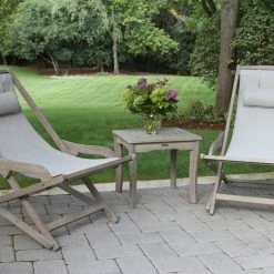 - Materials: sustainable plantation-grown eucalyptus and woven resin sling