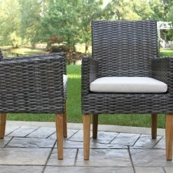 A mix of natural teak wood and slate brown, woven wicker makes this 7-piece teak dining set just right for your coastal patio decor. It includes a trestle table with an umbrella hole and six outdoor dining chairs that are great for sharing a home-cooked meal and good times with loved ones. The dining table is crafted with an easy-to-clean concrete tabletop and a solid teak wood base that will weather to a classic Nantucket gray over time. The armchairs are crafted with rust-free aluminum frames wrapped in all-weather resin wicker and topped with cushions with machine-washable Sunbrella covers. All this patio dining furniture is weather-resistant, so it’s sure to hold up to sun and rain and stay looking just right.