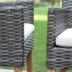 - Color: Natural teak, slate wicker, canvas flax cushion, and a grey/blue tabletop