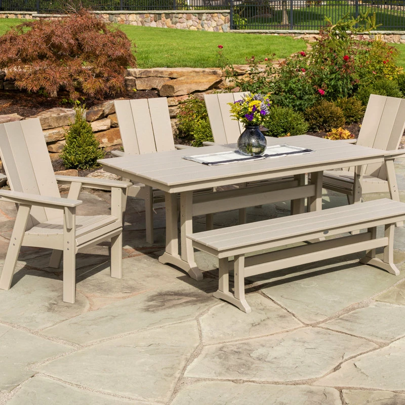 You’ll want to enjoy every meal outside gathered with friends and family around this all-weather modern dining set. With room for six, the Modern Adirondack 6-Piece Farmhouse Dining Set with Bench provides comfortably contoured seats with a contemporary look. The Modern Adirondack Dining Chairs also feature a waterfall front detail while the Farmhouse 37″ x 72″ Dining Table provides plenty of legroom underneath.