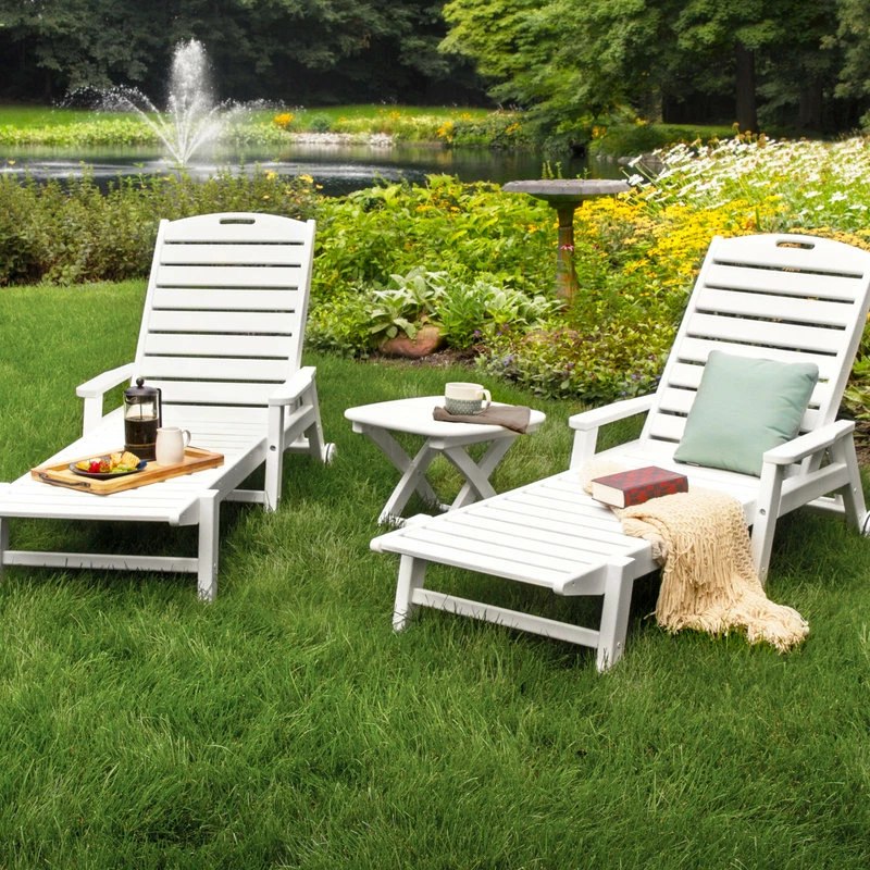 You’ll feel like you’re lounging on the deck of a luxurious cruise ship when you experience the POLYWOOD Nautical 3-Piece Chaise Set. Designed for ultimate relaxation, this set includes two Nautical Wheeled Chaises with Arms and a Nautical Side Table. The chaises feature five adjustable positions and are easy to stack and store when flat. The companion table is just the right size for drinks, snacks and a good book. This durable set is constructed of solid POLYWOOD recycled lumber, which gives it the look of painted wood without the maintenance wood requires