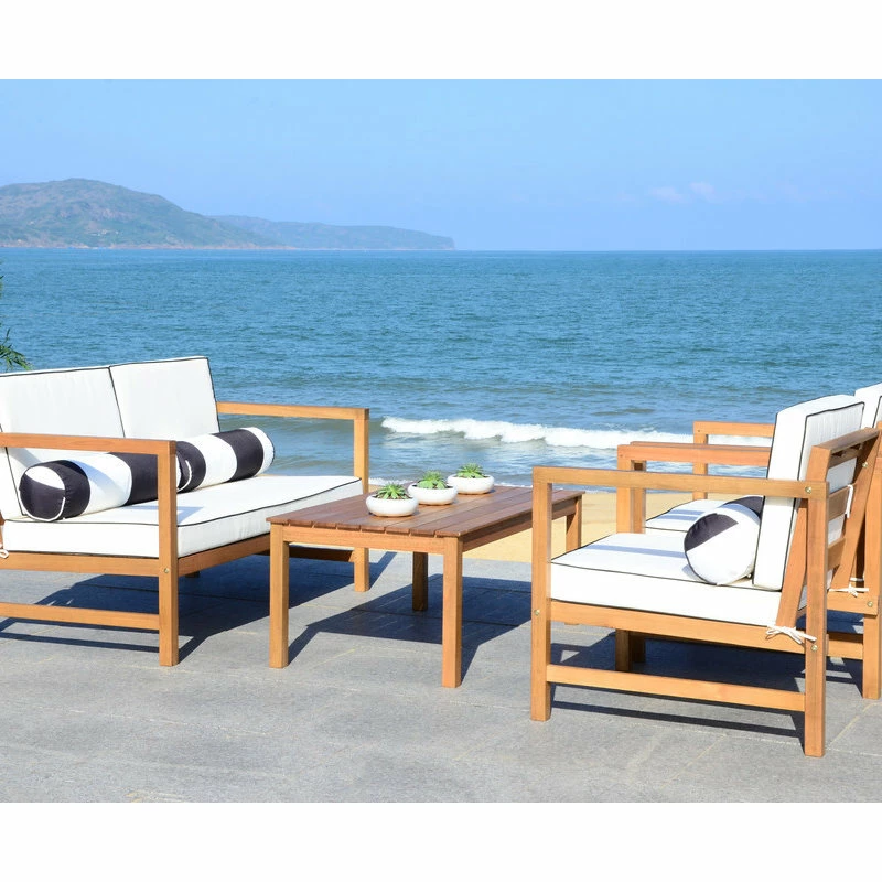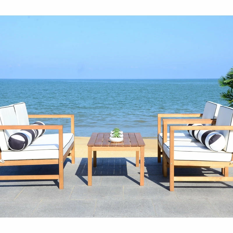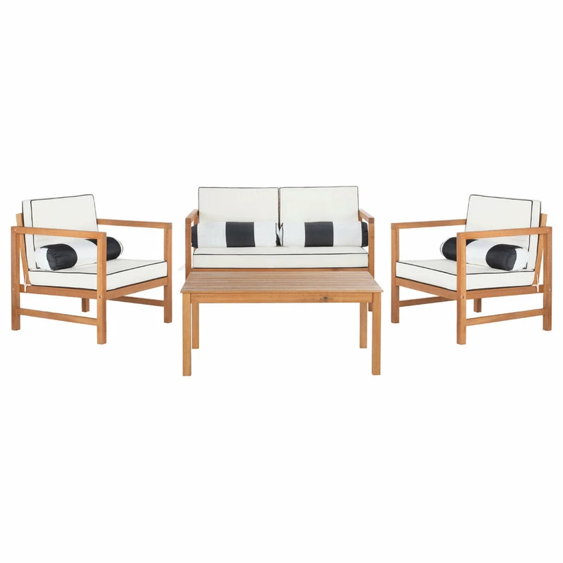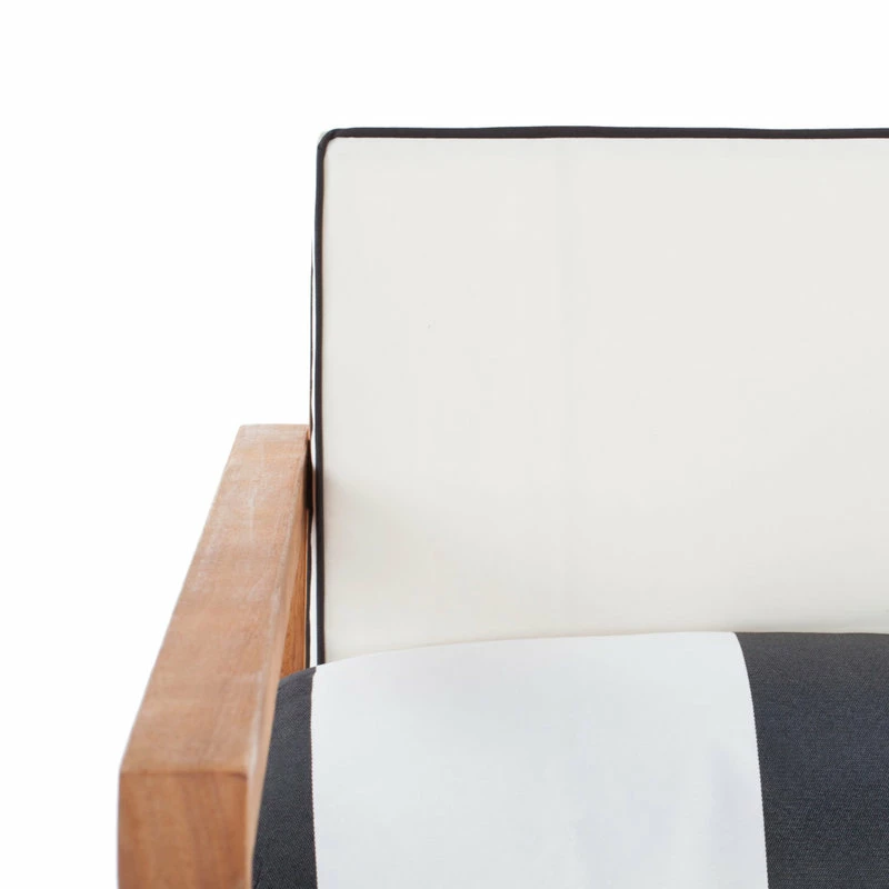 The perfect pairing of form and function, this contemporary 4-piece outdoor set was inspired by the home of LA’s top interior designer. Crafted in a teak hue, its sleek lines are illuminated with black upholstery that pops with complementary accent pillows.