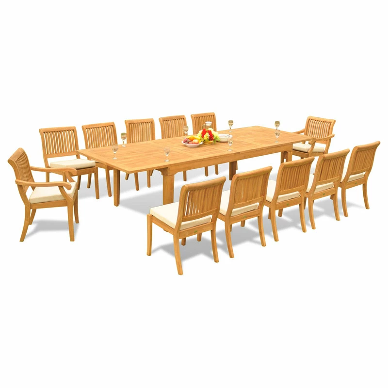 Set includes: 122″ Double Extension Rectangle Dining Table and 12 Stacking Chairs (2 Arms, 10 Armless).