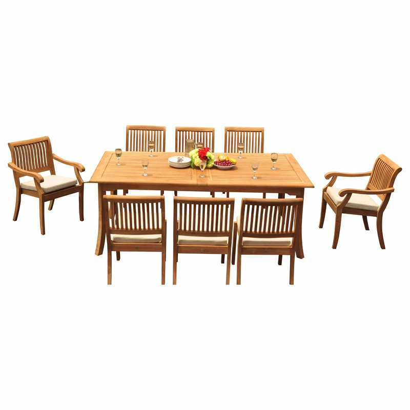 Set includes: 117″ Double Extension Rectangle Dining Table and 8 Stacking Chairs (2 Arms, 6 Armless).
