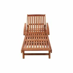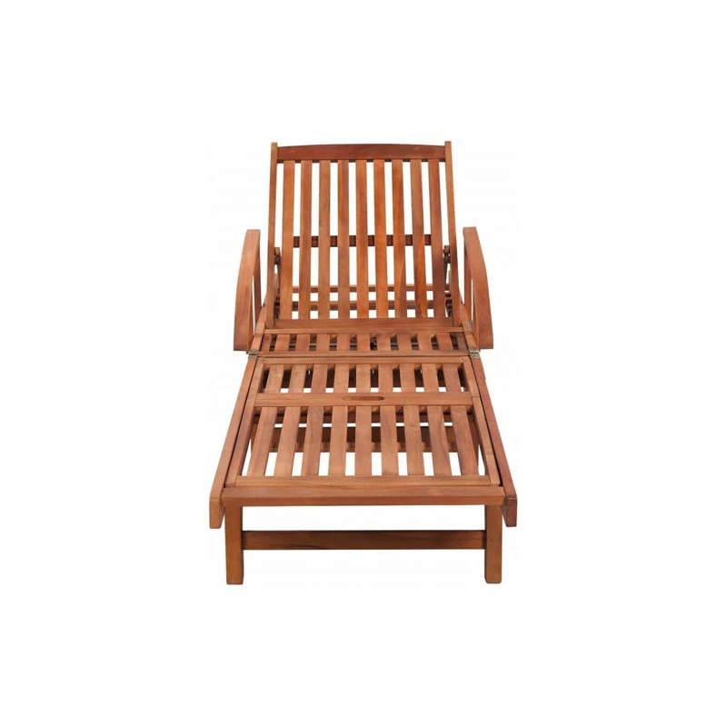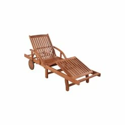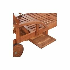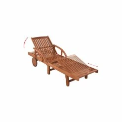This classic wooden garden lounger has an attractive slatted design, and will add a touch of rustic charm to your garden, patio, pool deck or other outdoor living space. This daybed is made of durable, solid acacia wood, which has been finished with a natural oil coating and is characterized by its excellent weather-resistance. Therefore, our sun lounger is extremely suitable for outdoor use. Equipped with 2 wheels, it can be easily moved around. The chaise lounge boasts a convenient pull-out table, on which you can place your phone, sunglasses, drink and other small items. The backrest can be adjusted in 5 positions, from fully upright to completely flat. The footrest is also adjustable. The seat and backrest slats offer great support and are comfortable as well, and two armrests give you a place to rest your arms. This daybed is delivered with highly comfortable, thickly padded seat and back cushions. The cushion covers are removable and washable. Take a load off on this lovely sun lounger!